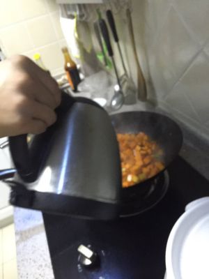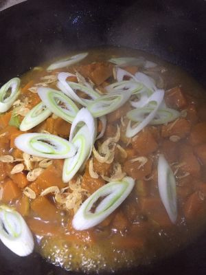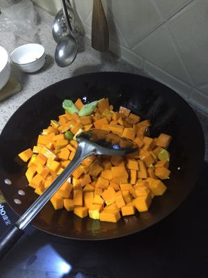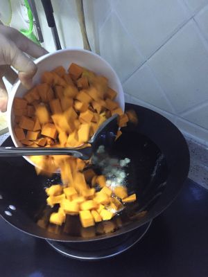 油中放入大蒜粒,生姜,辣椒爆香后放入南瓜