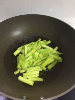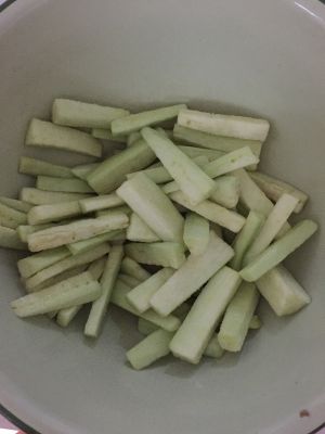 茄子打皮切条 然后加盐拌均 稍等一下 把水沥干