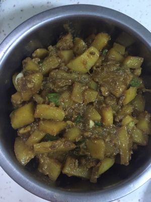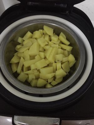 把土豆切成小块 放入电饭锅与米饭一起蒸熟 这样和茄子在一起很快熟