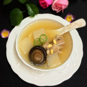 萝卜去皮洗净切小块,香菇和黄豆均洗净。