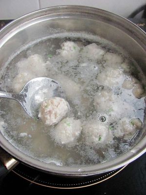 这时另取一个锅加入冷水,把剁好的肉馅做成肉圆煮至浮起关火备用。