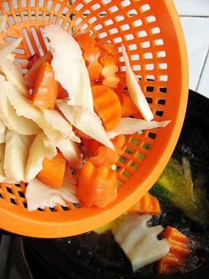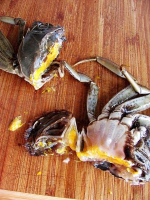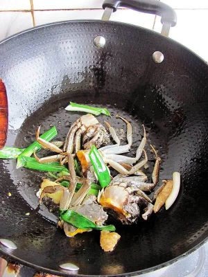 爆香葱姜,倒入螃蟹翻炒片刻。