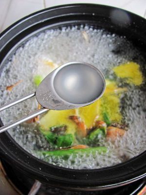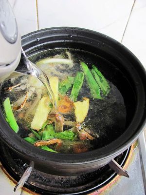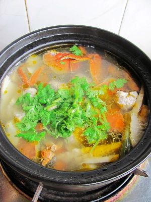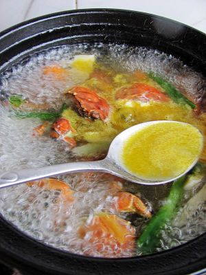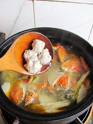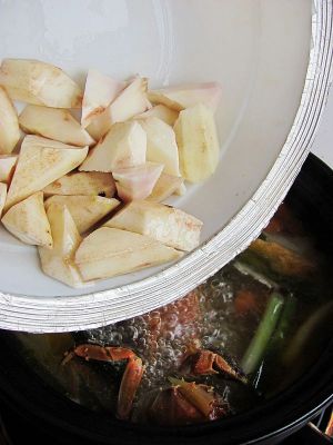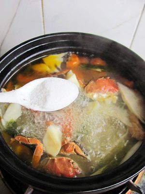 蟹锅煮上15分钟后加入盐,胡椒粉调味。