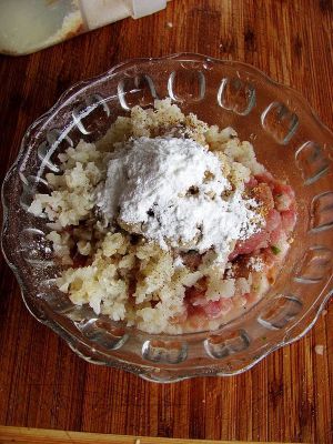 鸡肉,猪肉,莲藕剁碎,肉泥加入莲藕末加入盐,白糖,料酒,鸡精,淀粉搅拌均匀成为肉馅。