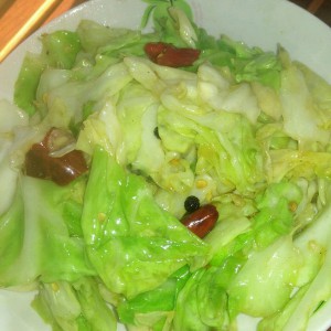 再将包菜倒入继续翻炒,放盐,鸡精,味精少许陈醋