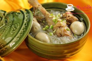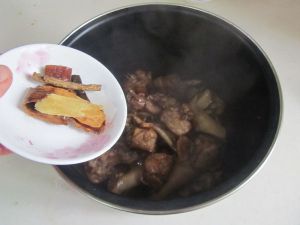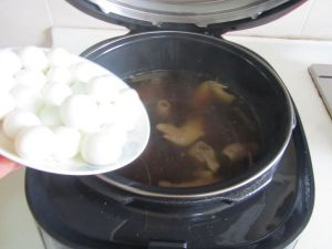 高压锅气压阀消后, 打开锅盖, 加入鹌鹑蛋、粉丝与鸡杂;