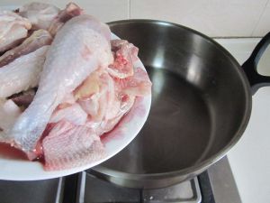 将鸡块中的水分煸炒出来后加入姜片继续翻炒;