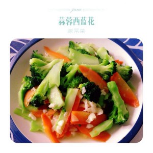 倒入西蓝花胡萝卜,放适量盐和一点点水翻炒