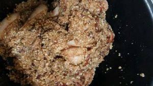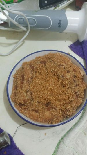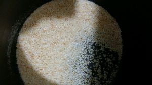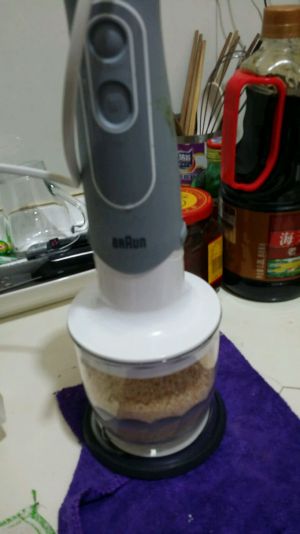 炒好的米凉了以后,用擀面棍,或者加工机打碎一些。。