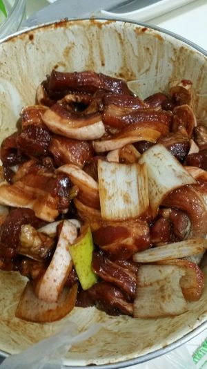 五花肉带皮,切0.8-1.2cm间的均匀的厚片,准备老抽,酱豆腐汤(半块酱豆腐),葱段,姜片,糖,盐,白酒,用这些调料拌均匀,老抽上色比较深,注意用量。