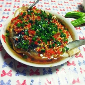 鱼头蒸好后撒上葱花 (鱼出锅如蒸的水多了可以用勺子舀掉一些)