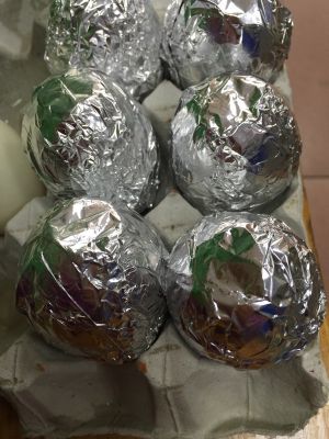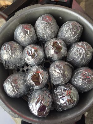 高压锅里放入蒸架,加入少量水,放上包好锡纸的蛋,一锅刚刚好放13个