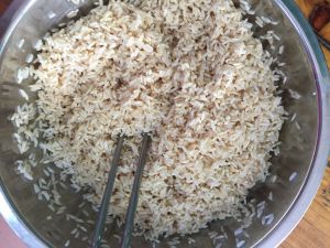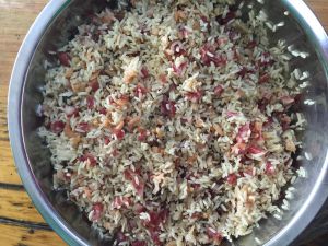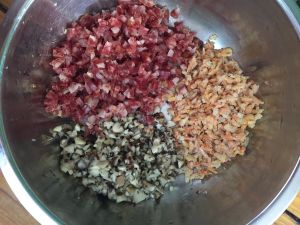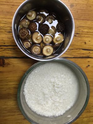 用酱油腌好的糯米加入腊肠,香菇、虾仁一起拌匀备用