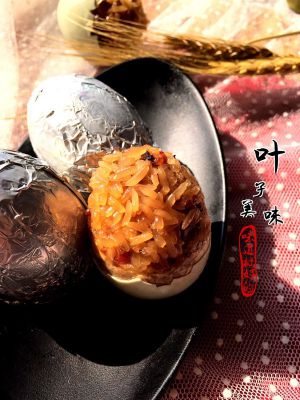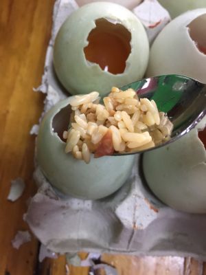 用小勺子把糯米馅料填入鸭蛋内,装9分满就可以