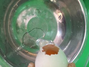 鸭蛋表面洗净,顶部轻轻敲一下,用手掰开一个小洞,倒出里面的蛋清,留下蛋黄备用