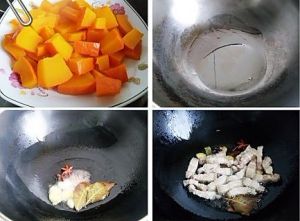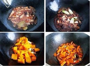倒入南瓜块翻炒均匀,关火,盖上锅盖焖5分钟即可。