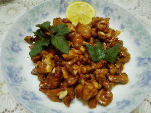 等收汁到差不多时盛出放盘,另起油锅,下蒜粒煸炒出香味,淋在鸡肉上。