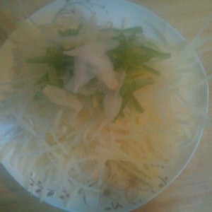 土豆丝、青椒丝、大蒜片、盐少于、味精,准备好以后,全部装进一个盘子