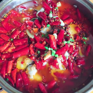 把冒烟的油淋在辣椒上。会听到次啦次啦的 香味随之而出。铛铛水煮鱼好了