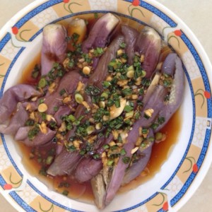 调味料:蒜泥两瓣(用刀背拍碎后稍微跺细,不要直接切成蒜粒,否则不香),小香葱一条切成葱花,适量生抽(根据茄子的量而定)、少许糖、芝麻油一小匙,然后一大匙食用油烧到很热浇到调味料碗里,调味料好了。