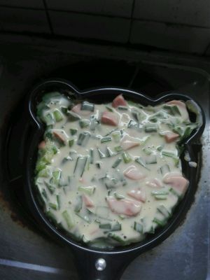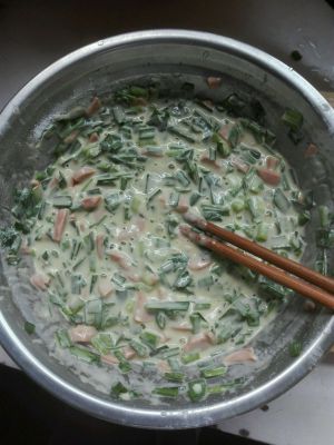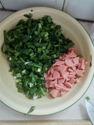把韭菜,火腿肠,小葱,洗净切块,留下备用。