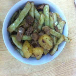 把锅烧热一些,放入肥肉炼出油来,出油后加入少许花椒面和白糖,炒几下放入少许豆油,之后放入瘦肉和葱花姜丝翻炒并加入料酒、几滴醋和适量酱油,肉变色后放入豆角和土豆。