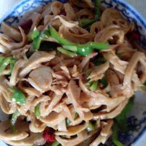 然后倒入面筋和菜椒翻炒均匀加入盐和十三香,等到九成熟加入鸡精老抽调味即可装盘