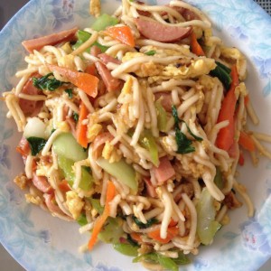 油热后依次放入胡萝卜丝火腿肠丝青菜翻炒加老酒盐,稍微加点糖。再加入鸡蛋丝,面条。翻炒加生抽少量。炒