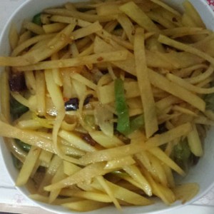 油烧热,放入姜蒜爆香后小火放入红辣椒,三分钟后有辣味后开大火放入土豆翻炒两分钟后加两勺醋和两勺料酒,盐,十三香,快出锅时放入青椒香油鸡精味精翻炒一会。哦了。这土豆是脆的,想吃面的切丝后就不要浸泡去汾,炒时加点水,最后放醋。