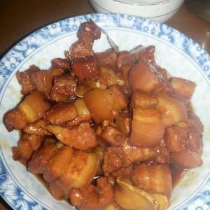 锅内放底油,花椒,干辣椒,丁香,香叶,桂皮炒香,放冰糖(敲碎了)炒化~慢慢中小火熬~熬至焦糖色,下肉,搅拌均匀,点一点老抽,两勺白糖(这个按个人口味,我做的比较甜,第一次做的话可以先少放些,之后炖的差不多的时候,尝味道,淡了再加)炒均匀后蓄水,水能埋着肉就好,放葱段儿,姜片。