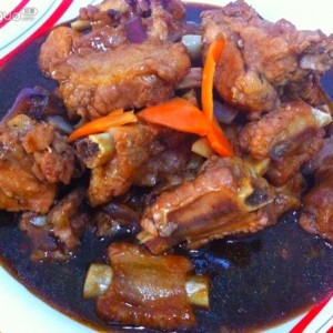 另取炒锅加入少量煮排骨的汤,加入葱姜蒜末,加入生抽、老抽和水淀粉调好汁烧开,放入熟排骨裹匀,再煮片刻入味即可出锅。