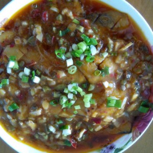 将炒好的芡汁浇在茄子上,撒上葱花,OK了。
