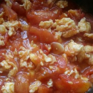 将油锅刷下,锅热后再放油,中火,油热后放入蒜片爆香,放入西红柿块,大火,放入些醋(增加西红柿的酸味),炒软后,放入少量酱油(提味),翻炒几下