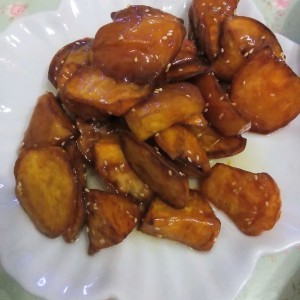 油温不要太高,(因为油温如果太高地瓜放进去表面就糊掉啦里面还不熟)手放到上面温乎乎的就可以啦,把地瓜放进去炸熟。(判断地瓜熟了的时候用筷子往中间扎一下如果很轻松的扎进去就证明熟啦。)