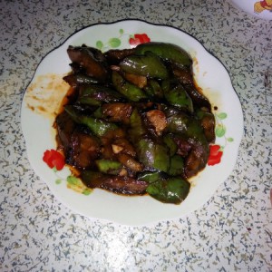 锅烧热放油,烧热后放入茄子,炒至金黄色,再放入姜蒜翻炒两下