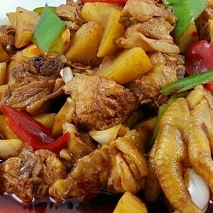 4、加入开水,没过鸡块即可,烧开后加入土豆,盖上盖转小火20分钟。加青红椒、盐,大火收汁。