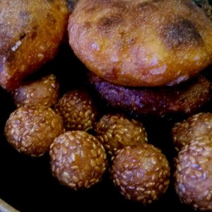 炸熟,炸的时候火不要大,因为糖粉多,容易上色。炸的时候轻压一下饼,就会变得鼓鼓的。