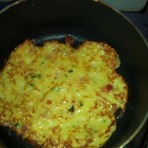 不粘锅里倒点油,用烫勺压成饼状