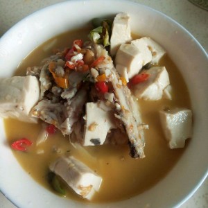 烧红油,然后放姜,然后把鱼放里面炸,然后放水煮,煮的时候放酸辣椒和剁辣椒,等汤汁白了以后放豆腐,出锅放味精和葱