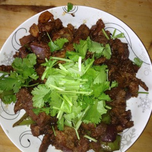 把羊肉炒到剩少许汁水放入盐 孜然 辣椒面 孜然要多放 然后出锅撒上香菜就o啦