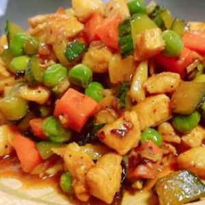 热油炝锅,葱蒜辣椒末炒香,下鸡肉丁,炒至发白,下配菜,翻炒几下,倒入调料汁,小火炖一会