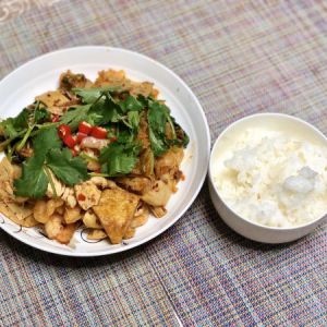 8.出锅撒香菜碎、花生碎、小米椒,一碗米饭开吃。