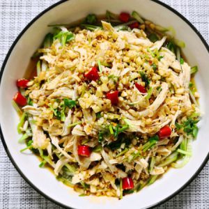 鸡胸肉洗净,锅中放水,鸡胸肉凉水下锅,加入1勺料酒、姜片、葱段,大火烧开,转至中火加盖,煮熟(用筷子扎透没有血水就是熟了)