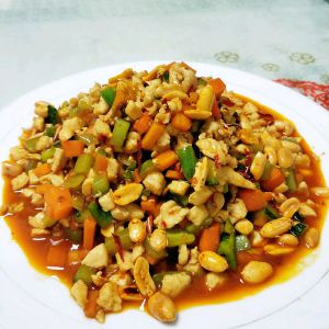 胡萝卜切丁,黄瓜切丁,鸡胸肉拍拍切丁,青椒切丁,葱,姜,干辣椒都切丁,大蒜随自己选择