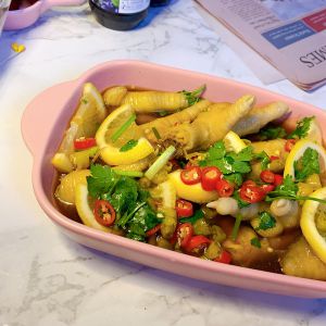鸡爪洗净,锅中加水放入鸡爪放入几片的姜片、一根小葱、花椒适量的盐