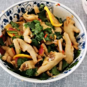 在凉水泡鸡爪的时候,准备好蒜、小米辣、洋葱、香菜(个人喜欢切碎),柠檬切片,加入适量盐、生抽、香醋、耗油、白糖等(可适量加点凉开水)放入鸡爪一起拌匀,密封放入冰箱冷藏4小时即可食用,可根据个人口味调整辣度咸度