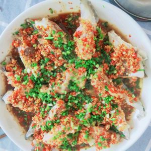 腌制好的鱼头摆在盘中,放上剁辣,上锅蒸10分钟左右,出锅撒上小葱,浇上热油。就可以了