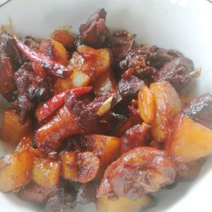 加入土豆,不要翻炒大火收汁,最后加入盐翻炒均匀…有小葱的,撒点葱花…
