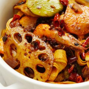 基围虾开边剪去须,沥干水分;莴苣切片、莲藕和红薯去皮切0.5厘米薄片;千张切粗条;蒜、洋葱和辣椒干切小;莴苣切片过热水,十几秒捞起,沥干水分备用