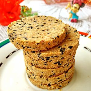 用料:熟黄豆面40克,熟白芝麻50克,熟黑芝麻25克,黄油10克,细砂糖30克,鸡蛋清16克,小苏打1/8小勺